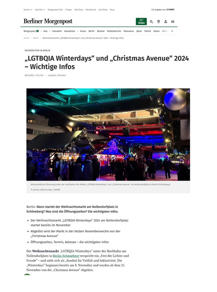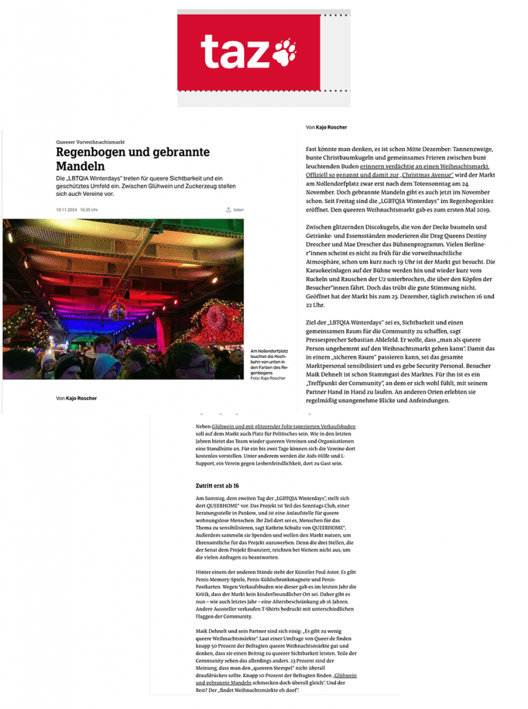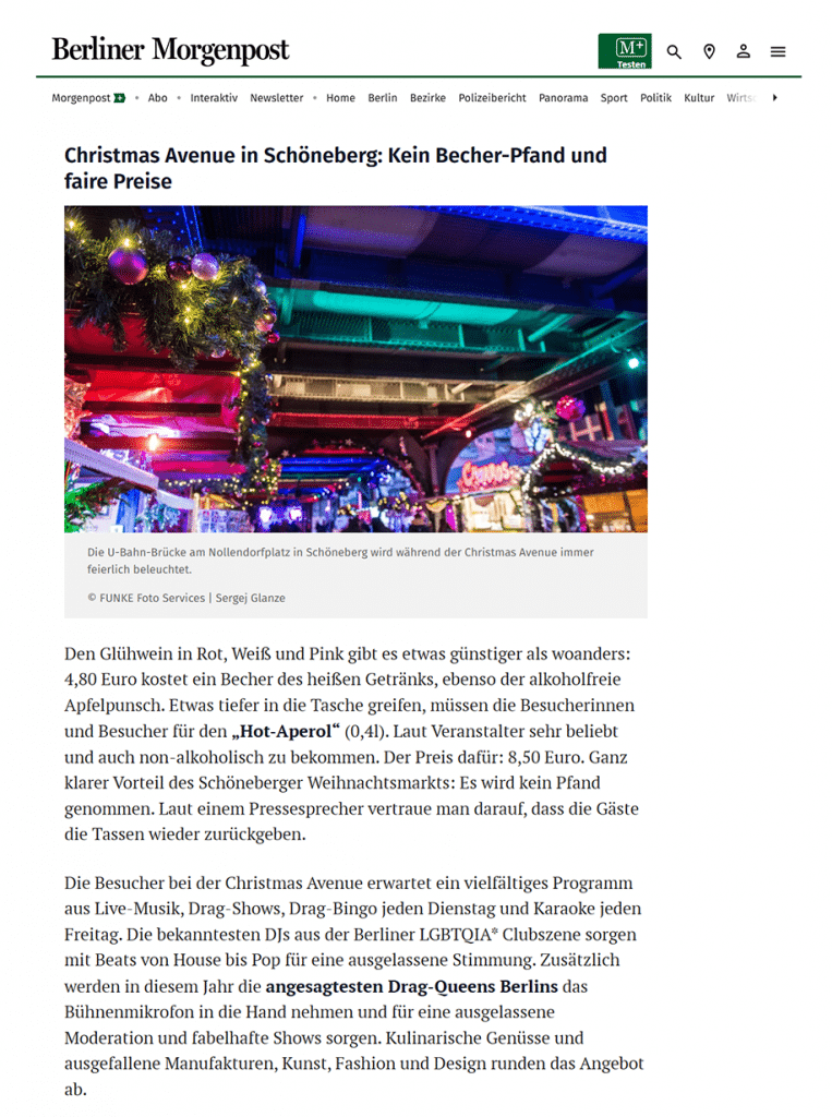 Hier findest du eine Auswahl der spannendsten Presseberichte über die Christmas Avenue 2023. Von Drag Bingo bis hin zur besonderen Atmosphäre unseres queeren Weihnachtsmarktes – hier erfährst du, was im letzten Jahr für Aufsehen gesorgt hat. Aufbereitet, um dir einen umfassenden Überblick zu bieten